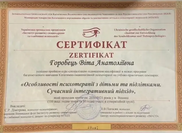 Українська громадська організація “Інститут розвитку символдрами та глибинної психології, Особливості психотерапії з дітьми та підлітками. Сучасний інтегративний підхід, 2020-2021 рр.